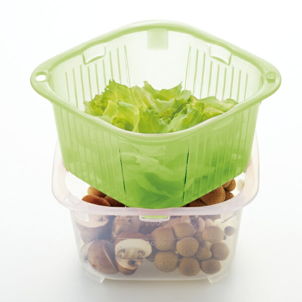 野菜を洗う時は、ボウルにザルを重ねて水を入れても食材がこぼれない設計になっています。